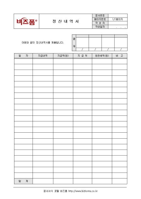 일자, 지급내역, 지급액, 지급처, 원천세액 등의 항목으로 구성되어있는 정산내역서입니다.