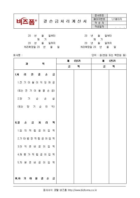 결손금처리에 관한 사항을 기록하는 결손금처리계산서입니다. 과목, 당기, 제기 등의 항목으로 구성되어있습니다.