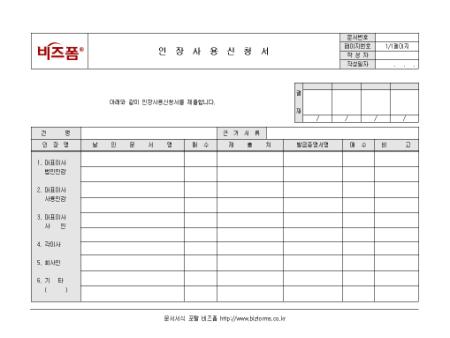 인장사용을 신청할 때 사용하는 인장사용신청서입니다. 건명, 인장명, 날인문서명, 매수 등의 항목으로 구성되어있습니다.