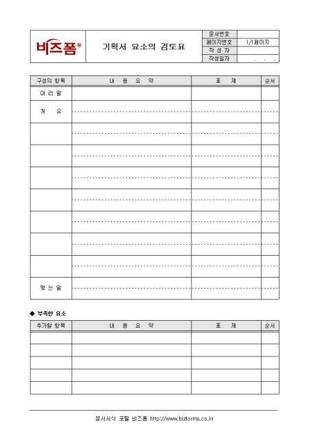 기획서 구성요소에 대한 검토 및 우선순위를 정할 때 사용할 수 있는 기획서 요소의 검토표입니다. 구성의 항목, 내용요약, 표제, 순서 등의 항목으로 구성되어있습니다.