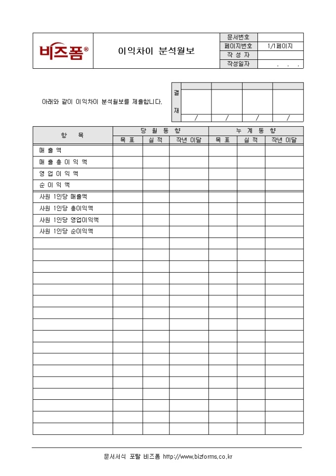 9,000원/월월간 매출 및 이익에 관한 사항을 분석/ 보고할 때 사용하는 이익차이분석월보입니다. 항목, 목표, 실적, 작년 이달 등의 항목으로 구성되어있습니다.