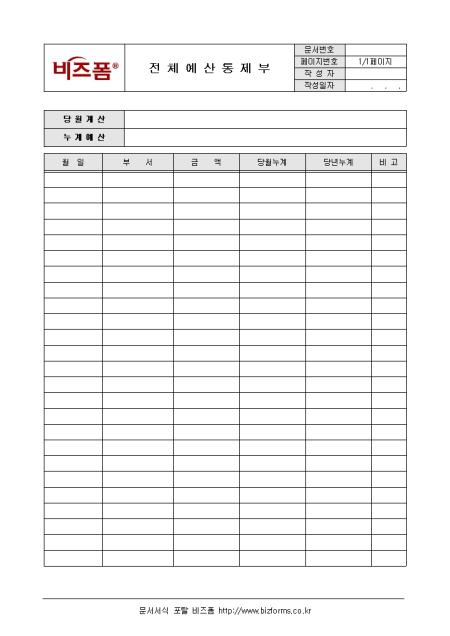 부서별로 전체예산에 관한 사항을 기록/ 관리할 수 있는 전체예산 통제부입니다. 당월계산, 누계예산, 월일, 부서, 금액 등의 항목으로 구성되어있습니다.