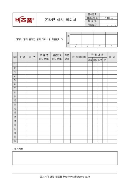 온라인 설치를 의뢰하는 온라인설치의뢰서입니다. NO, 성명, 사번, 모델명, 일련번호, 도면번호 등의 항목으로 구성되어있습니다.