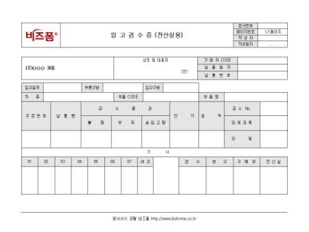 입고된 부품의 검수 현황을 기록하고 확인하는 입고검수증입니다. 입고일자, 부품구분, 입고구분, 주번번호,납품량 등의 항목으로 구성되어있습니다.