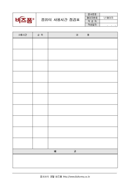 컴퓨터 사용시간을 기록하고 점검할 때 사용하는 컴퓨터 사용시간 점검표입니다. 사용시간, 순위, 내용 등의 항목으로 구성되어있습니다.