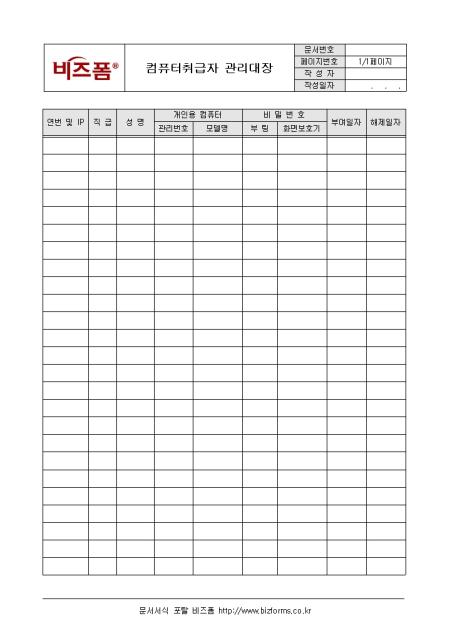 컴퓨터 취급자에 대한 현황을 기록/ 관리할 때 사용하는 컴퓨터취급자 관리대장입니다. 연번 및 IP, 직급, 성명, 관리번호, 모델명 등의 항목으로 구성되어있습니다.