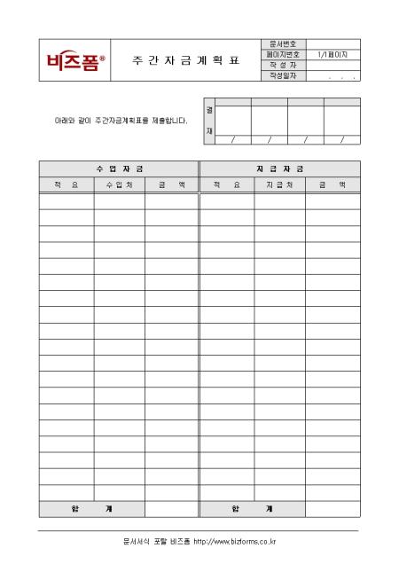 주간 자금에 대한 계획 수립 시 사용할 수 있는 주간자금계획표입니다. 수입자금, 지급자금, 합계 등의 항목으로 구성되어있습니다.