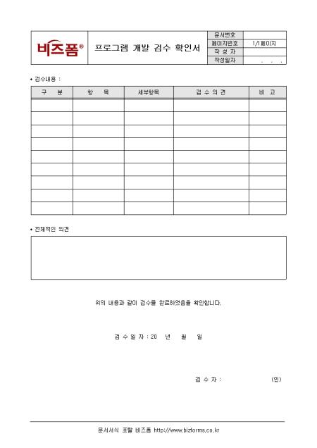프로그램 개발에 대해 검수내역을 확인하는 프로그램 개발 검수 확인서입니다. 구분, 항목, 세부항목, 검수의견 등의 항목으로 구성되어있습니다.