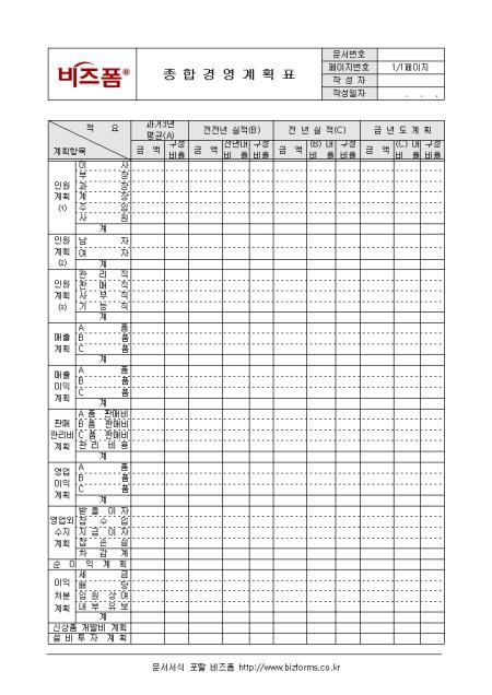 경영에 관한 종합적인 계획 수립 시 사용할 수 있는 종합경영계획표입니다. 인원계획, 매출계획, 매출이익계획, 판매관리비계획 등의 항목으로 구성되어있습니다.