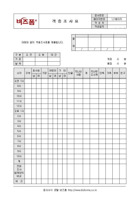 고객층에 관한 전반적인 사항을 조사하고 기록/ 관리할 수 있는 객층조사표입니다. 시각, 주부, 회사원, 가장, 어린이, 기타 등의 항목으로 구성되어있습니다.