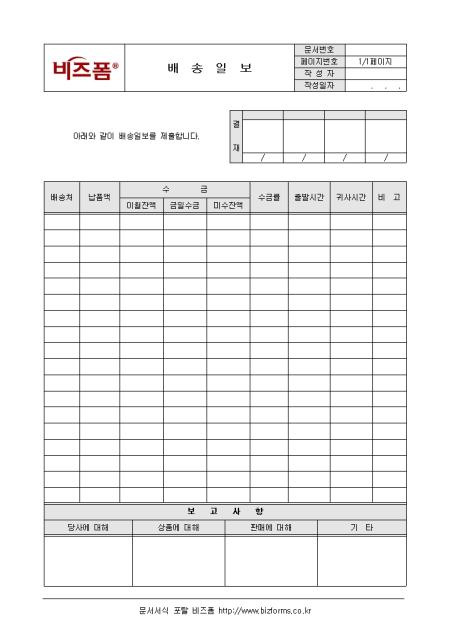 일일 배송에 관한 내역을 기록/ 관리할 때 사용하는 배송일보입니다. 배송처, 납품액, 수금, 수금률 등의 항목으로 구성되어있습니다.