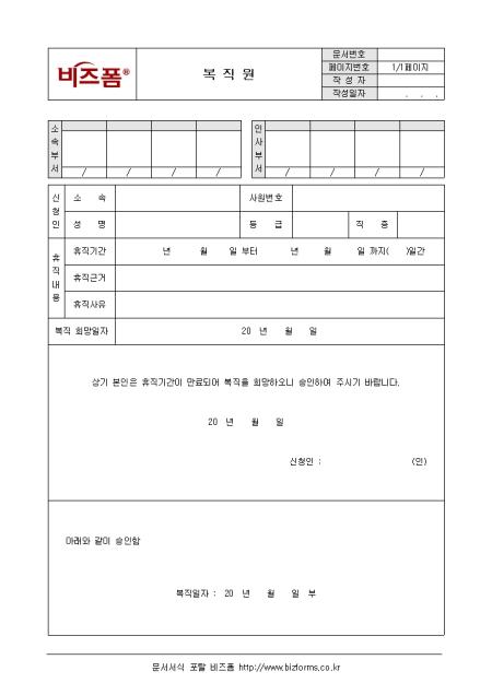 휴직기간이 만료되어 복직을 희망하고자 할 때 사용하는 복직원입니다. 신청인, 휴직내용, 복직 희망일자 등의 항목으로 구성되어있으며 휴직사유의 소멸을 증명하는 증빙서류를 첨부하여 총무부에 제출합니다.