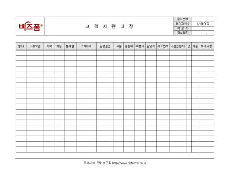일자, 거래처명, 지역, 채녈, 문제점, 조치내역 등의 항목으로 구성되어있는 고객지원대장입니다.