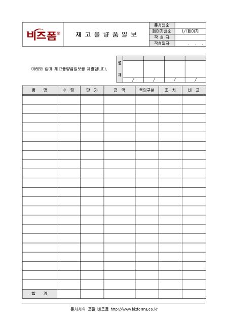 일일 재고 불량품에 관한 사항을 기록/ 관리할 수 있는 재고불량품일보입니다. 품명, 수량, 단가, 금액, 항목구분 등의 항목으로 구성되어있습니다.