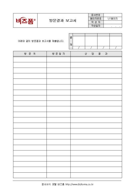 거래처 등의 방문 결과 내용을 기록/ 보고할 때 사용하는 방문결과 보고서입니다. 방문처, 방문일자, 상담결과 등의 항목으로 구성되어있습니다.