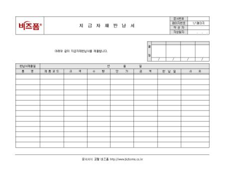지급된 자재를 반납할 때 사용하는 지급자재반납서입니다. 품명, 제품코드, 규격, 수량, 단가 등의 항목으로 구성되어있습니다.