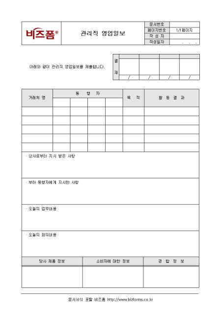 관리직 근로자의 영업에 관한 사항을 기록/ 관리할 수 있는 관리직영업일보입니다. 거래처명, 동행자, 목적, 활동결과 등의 항목으로 구성되어있습니다.