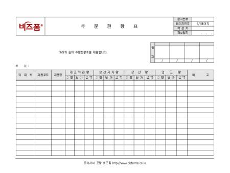 제품의 주문현황에 관한 사항을 기록/ 관리할 수 있는 주문현황표입니다. 의뢰처, 제품코드, 제품명, 제조의뢰량, 생산지시량 등의 항목으로 구성되어있습니다.