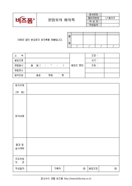 분임조의 회의 내용을 기록하는 분임토의 회의록입니다. 토의주제, 토의내용, 결과 및 실시계획 등의 항목으로 구성되어있으며 작성 후 실무위원에게 제출합니다.