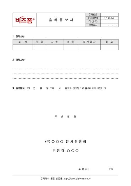 인사위원회에 출석을 통보할 때 사용할 수 있는 출석통보서입니다. 인적사항, 심의사항, 출석일자 등의 항목으로 구성되어있습니다.