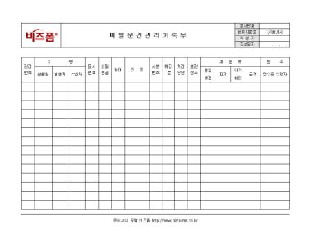 비밀문건을 기록/관리할 때 사용하는 비밀문건관리기록부입니다. 관리번호, 수량, 문서번호, 건명 등의 항목으로 구성되어있으며 보관부서 보관책임관이 기록/관리합니다.
