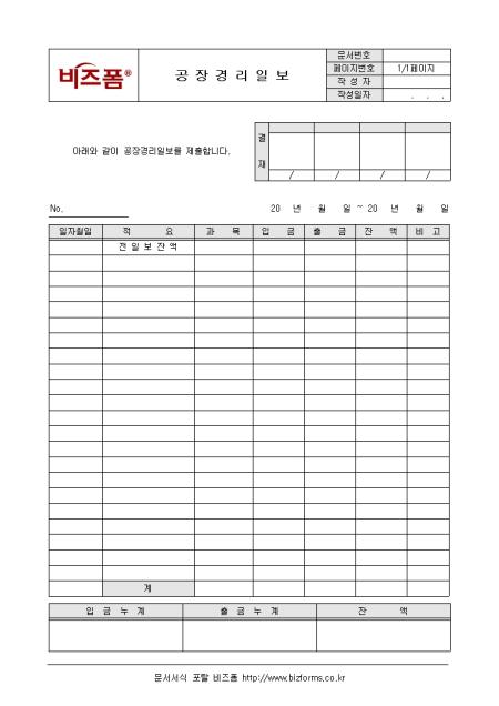 공장경리의 일일 업무내역을 정리할 수 있는 공장경리일보입니다. 일자월일, 적요, 과목, 입금, 출금 등의 항목으로 구성되어있습니다.