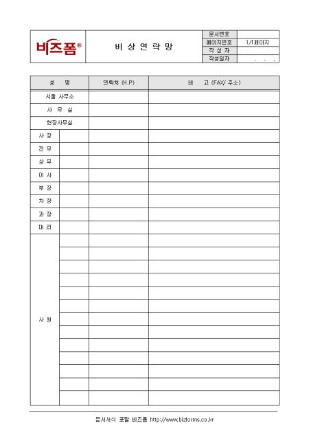 직원의 비상연락처를 기록하는 비상연락망입니다. 성명, 연락처, 비고의 항목으로 구성되어있으며 당직실에 항상 비치되어있어야 합니다.