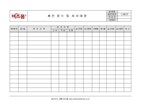 제안자의 제안을 접수하고 그 처리 내역을 기록/ 관리할 수 있는 제안 접수 및 처리대장입니다. 제안번호, 접수일, 제안건명, 심사의뢰 등의 항목으로 구성되어어있습니다.