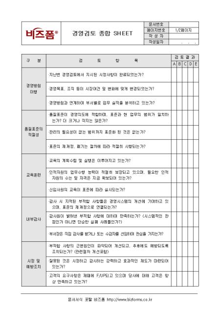 경영에 관한 전반적인 사항을 종합적으로 검토할 수 있는 경영검토 종합 SHEET입니다. 경영방침 이행, 품질표준의 적절성, 교육훈련, 내부감사, 검토항목 등의 항목으로 구성되어있습니다.