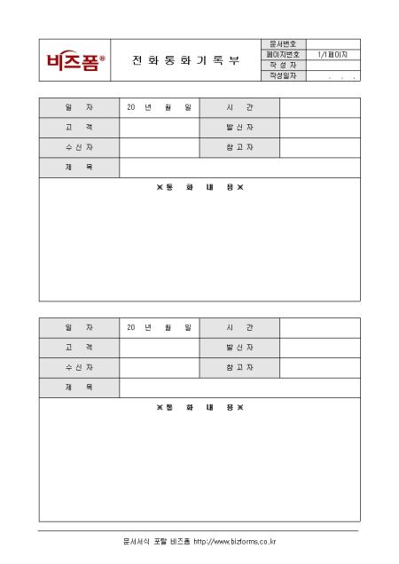 전화통화 내용을 기록/ 관리할 수 있는 전화통화기록부입니다. 일자, 고객, 수신자, 제목, 내용 등의 항목으로 구성되어있습니다.