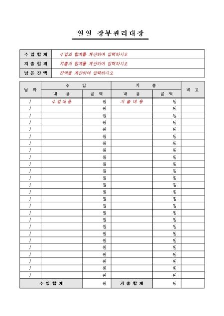 경리부에서 사용하는 장부관리서식으로 날짜별 수입 및 지출에 대한 내용 및 금액을 작성하여 일일 장부관리를 작성할 수 있는 일일 장부관리대장입니다.