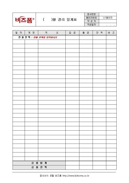 경리부서에서 사용하는 경리일계표서식으로 월별 입/출금 및 잔액을 한눈에 알아볼수있도록 작성가능한 서식입니다.