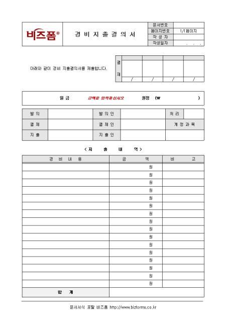 경리부에서 사용하는 서식으로 경비의 지출내역에 대하여 자세히 작성할 수 있는 지출결의서 서식입니다. 경비내용과 금액을 작성하여 총 금액을 기재하여 제출할 수 있습니다.