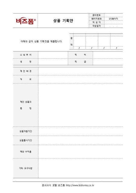 기획부에서 사용하는 서식으로 새로운 상품에 대한 기획안을 제출할 때 작성하여 사용할 수 있는 상품기획안 양식입니다. 제안배경, 개요, 상품의 특징, 개발기간, 수익률 등의 항목으로 구성되어 있습니다.