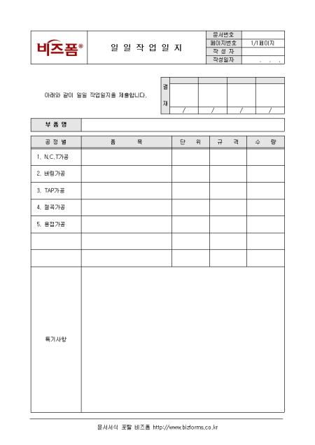부품별 제작 가공에 대한 일일작업일지서식입니다. 공정과 품목, 단위, 규격, 수량 등의 항목으로 구성되어있으며 특기사항 등을 작성할 수 있습니다.