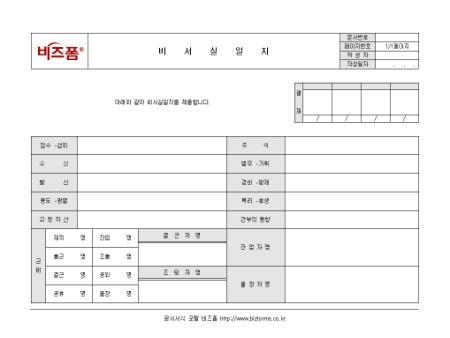 회사 비서실에서 사용할 수 있는 비서실일지입니다. 수신, 발신, 고정자산, 주식, 근태, 간부의 동향 등의 항목으로 구성되어있습니다.