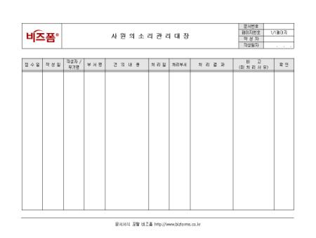 사원들의 건의 및 요청사항 등의 소리를 기록/ 관리할 수 있는 사원의소리 관리대장입니다. 접수일, 작성일, 부서명, 건의내용, 처리일 등의 항목으로 구성되어있습니다.