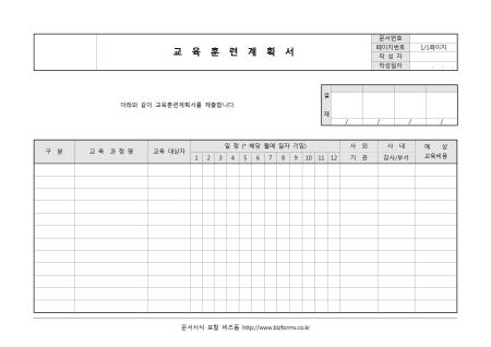 교육훈련계획 수립 시 사용할 수 있는 교육훈련계획서입니다. 구분, 교육과정명, 교육대상자, 일정 등의 항목으로 구성되어있습니다.