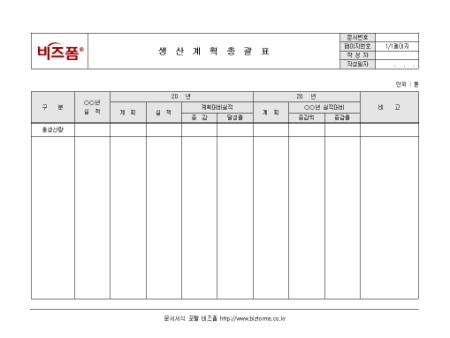 생산계획에 따른 증감내역과 달성율 등의 현황을 기록/ 관리할 수 있는 생산계획총괄표입니다. 구분, 계획, 실적, 계획대비실적 등의 항목으로 구성되어있습니다.