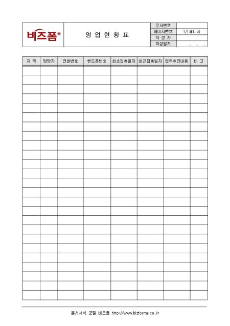 지역 담당자별로 영업현황을 기록/ 관리할 수 있는 영업현황표입니다. 지역, 담당자, 전화번호, 최초접촉일자 등의 항목으로 구성되어있습니다.