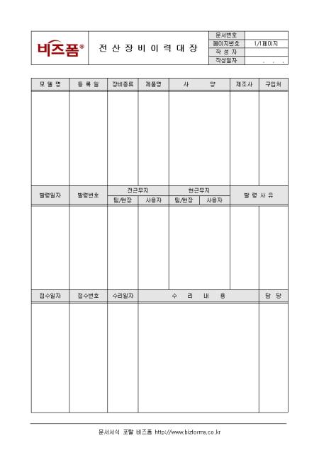 사내 전산장비에 관한 사항을 기록/ 관리할 수 있는 전산장비이력대장입니다. 모델명, 등록일, 장비종류, 제품명, 사양 등의 항목으로 구성되어있습니다.
