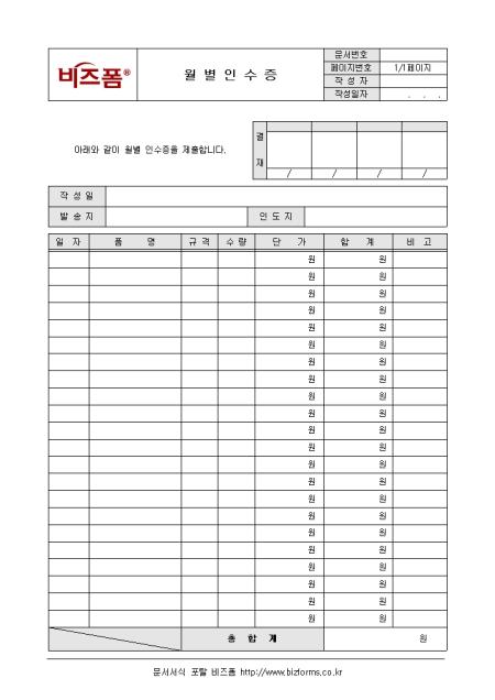 자재생산부에서 사용하는 월별인수증 서식입니다. 작성일 및 발송지 등을 작성하여 일자별로 물품의 인수증에 대한 기록을 작성하여 보관할 수 있도록 제작된 월별인수증입니다.