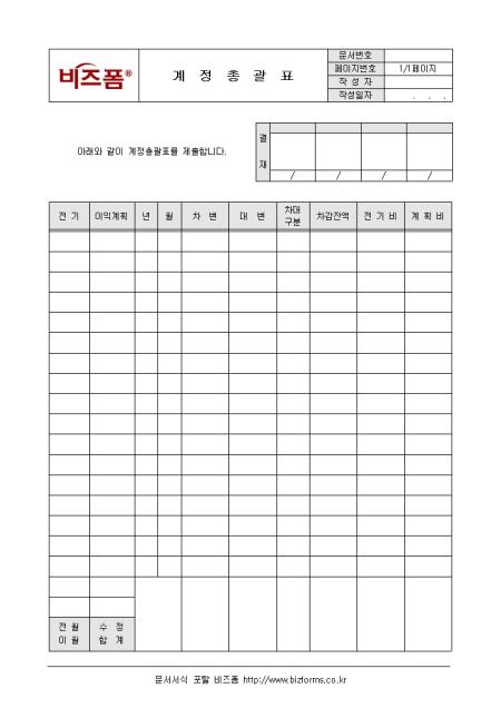 계정에 관한 사항을 총괄 기록/ 관리할 수 있는 계정총괄표입니다. 전기, 이익계획, 차변, 대변 등의 항목으로 구성되어있습니다.