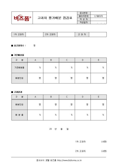 고과자가 평가에 대한 기준을 정해놓고 그에 따른 평가가 이루어질 수 있도록 관리할 수 있는 고과자 평가배분 점검표입니다. 총고과자수, 기준배분율, 고과결과 등의 항목으로 구성되어있습니다.