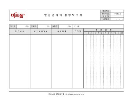 경영방침에 따른 세부실행계획과 실행목표 등을 기록/ 보고할 때 사용할 수 있는 방침관리의 실행보고서입니다. 경영방침, 세부실행계획, 실행목표, 추진일정 등의 항목으로 구성되어있습니다.