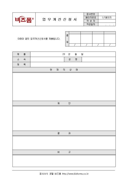 업무에 관래 현재의 상태를 진단하고 개선할 것을 요구할 때 사용할 수 있는 업무개선신청서입니다. 제출, 소속, 성명, 제목, 현재의 상태, 제안, 결과 등의 항목으로 구성되어있습니다.