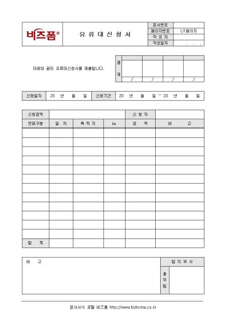 유류대 신청 시 사용할 수 있는 유류대신청서입니다. 신청일자, 신청기간, 신청금액, 연료구분, 일자, 목적지 등의 항목으로 구성되어있습니다.
