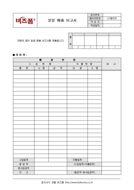일일 매출 현황을 기록/ 보고할 때 사용할 수 있는 일일매출보고서입니다. 수입현황, 지출현황 등의 항목으로 구성되어있습니다.