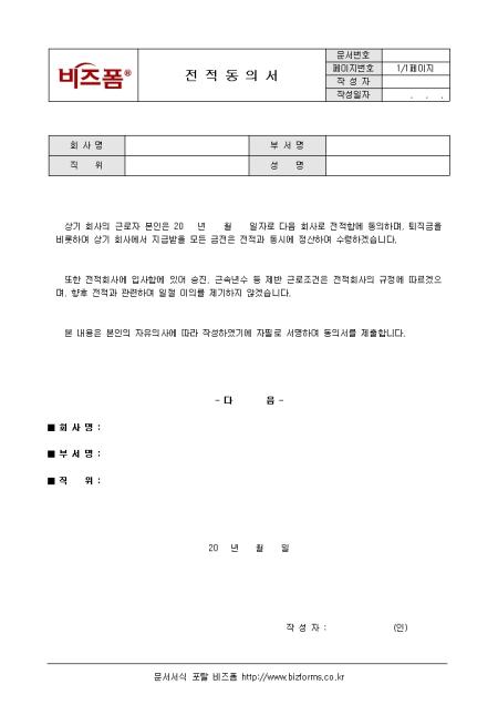 근로자가 전적에 동의하며, 그와 관련된 사항을 준수할 것을 동의한다는 내용의 전적동의서입니다.