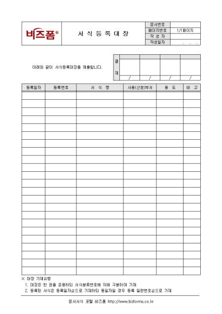 서식의 등록을 기록/관리하는 서식등록대장입니다. 등록일자, 등록번호, 서식명, 사용부서 등의 항목으로 구성되어있으며 서식등록대장은 한권을 운용하되 서식분류번호에 의해 구분하여 기재합니다.